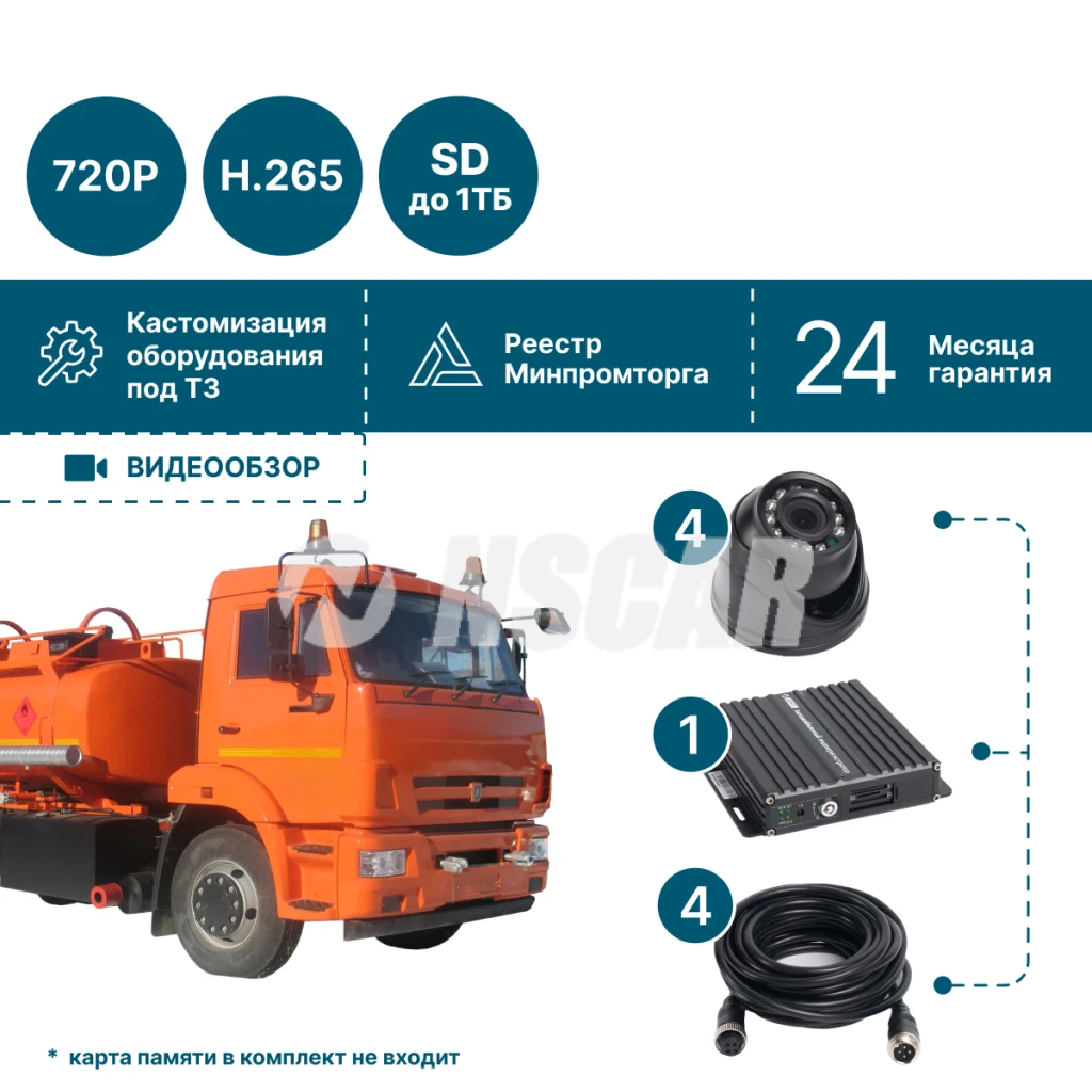 Готовый комплект офлайн видеонаблюдения NSCAR GT401_SD для грузового транспорта: 4 камеры, запись на SD.